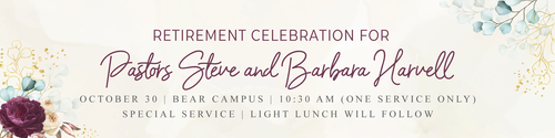 Join us on Sunday, October 30, for a Retirement Celebration as we honor Pastors Steve and Barbara for their years of service to the Lord and the impact they have made for the Kingdom of God! During the service, we will have a powerful time worship, inspiring testimonies, and other special elements that will bring both glory to God and appreciation to our founding pastors! A light lunch reception will follow, where you can fellowship together, snap a few pictures in our photo booth, and celebrate with Pastors Steve and Barbara! One service only at 10:30 AM at the Bear campus; Middletown please join us!