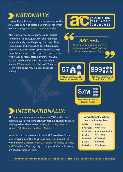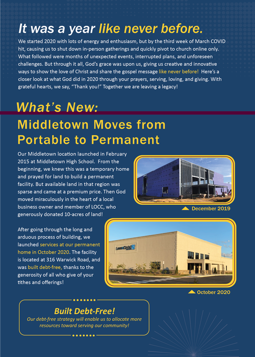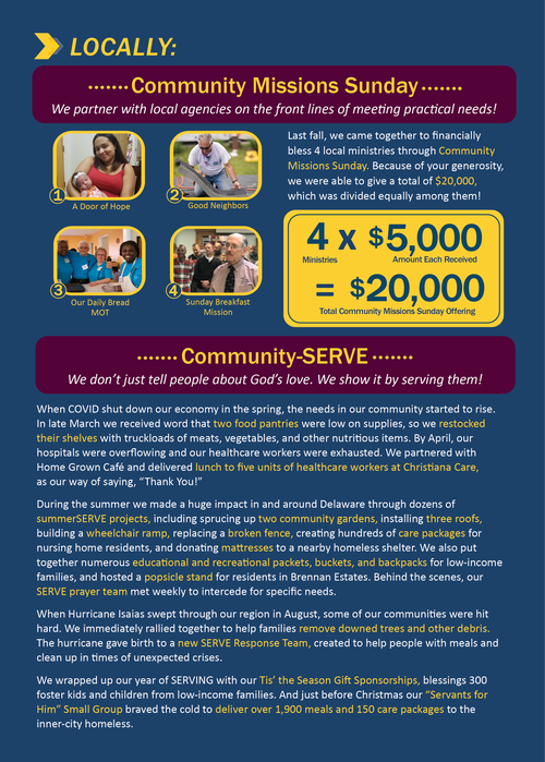 In 2020, God accomplished great things through your prayers, serving, giving, and loving! Take some time to read below and learn how your partnership in the gospel impacted the kingdom of God and made a significant difference in the lives of people – locally, nationally and internationally!